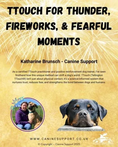 Join us for a Practical and Supportive 2-Hour Workshop to Learn How Tellington TTouch can Help Your Dog Feel Calmer and More Confident during Thunder, Fireworks and Everyday Noises.