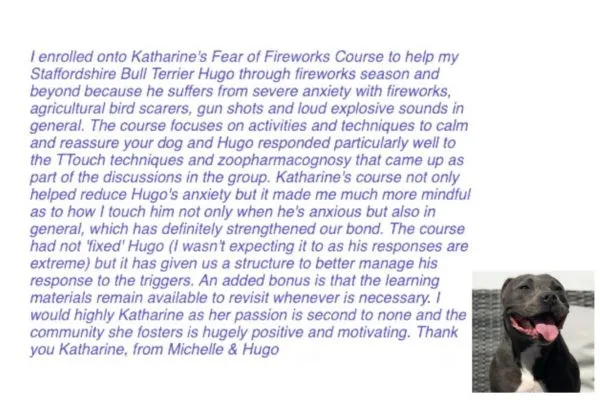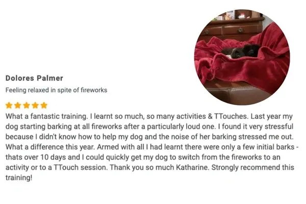 Many of the techniques we’ll explore in this workshop have already helped dogs and their owners through my online Fear of Fireworks course. From feeling helpless to feeling prepared, owners have seen real changes in their dogs’ confidence and calmness.